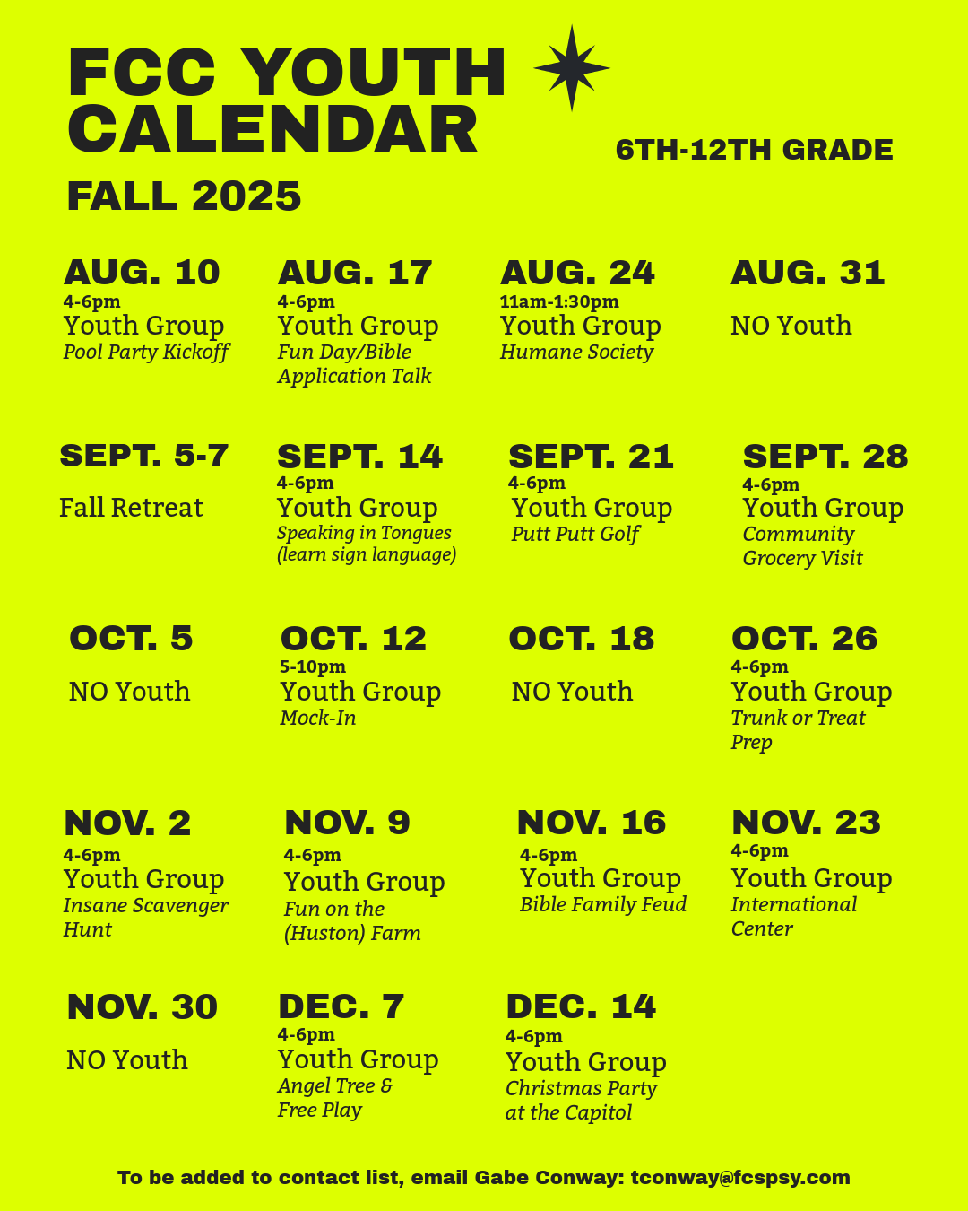 First Christian Church 1106 State St., Bowling Green, KY, United StatesYouth group is for 6th-12th graders. Email Gabe Conway to be added to the contact list