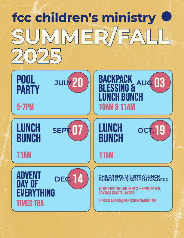 First Christian Church 1106 State St., Bowling Green, KY, United StatesAll 3rd-5th graders are invited to the Lunch Bunch room following worship on these dates, until 1pm, in the children's wing for food, fellowship, and fun lessons (Bible study) until 1pm. Led by Debbie Faircloth and Stacy Garden.